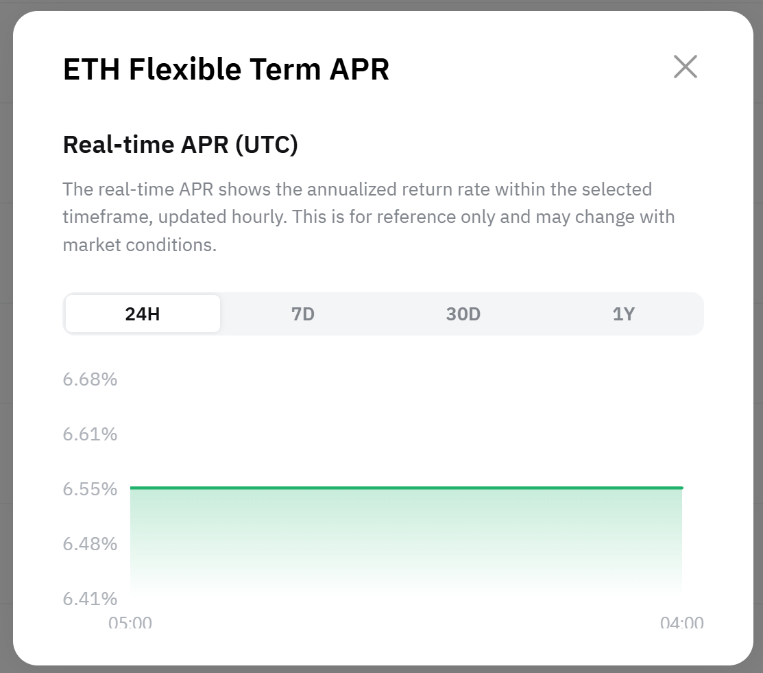 The real-time APR displayed in Flexible Term products is a floating, annualized return rate based on the selected timeframe, updated hourly. It is for reference only and may fluctuate due to market conditions, the loan-to-pool ratio and other factors.