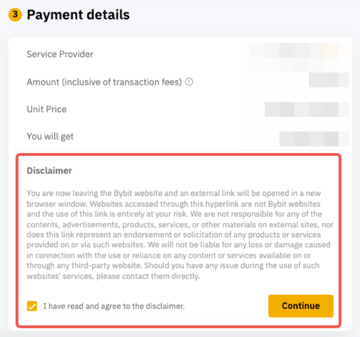 Step 6: Acknowledge the Disclaimer and click on Continue. You will be redirected to the third-party payment provider’s official webpage to proceed with the transaction.