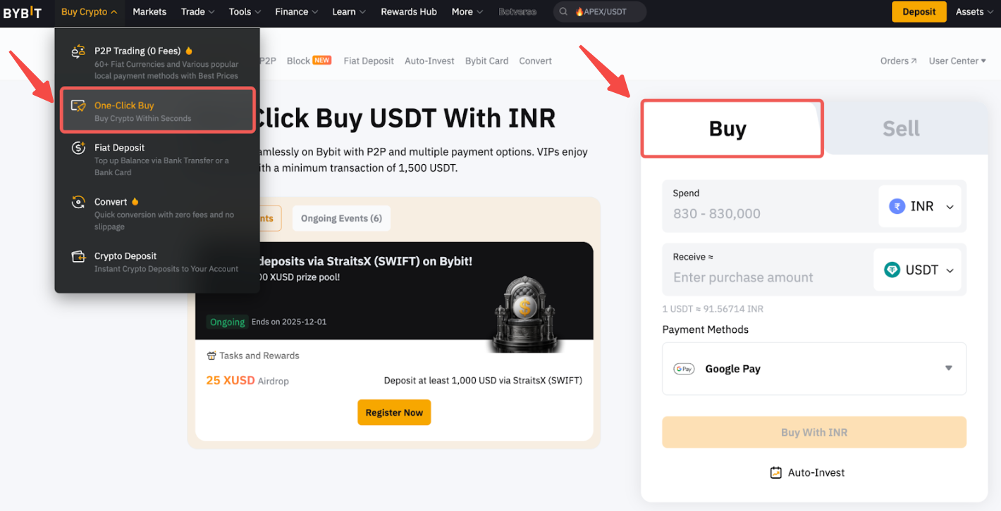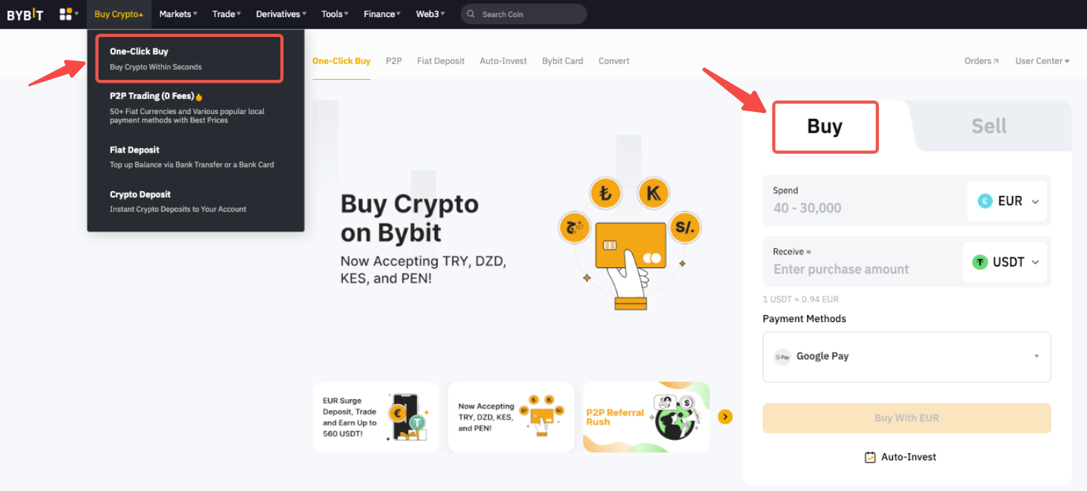 Step 1: Click on Buy Crypto One-Click Buy at the top left corner of the navigation bar to enter the Buy function page.