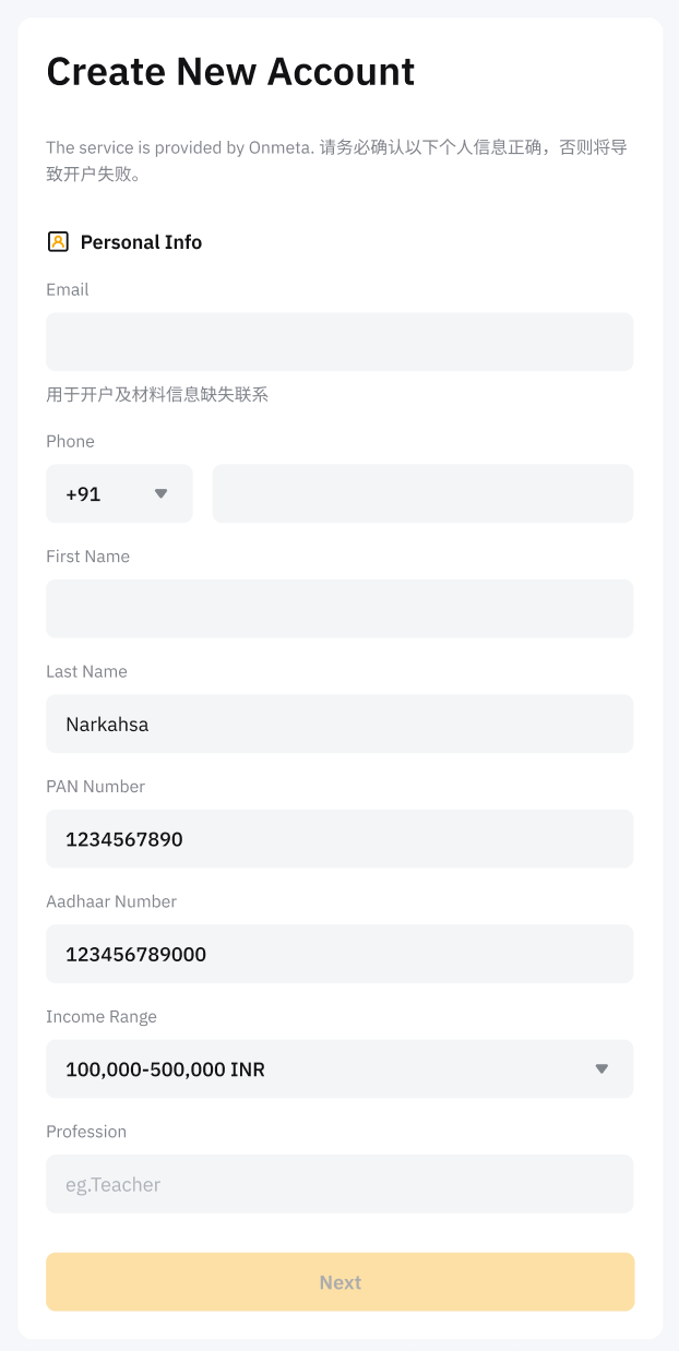 Step 3: On the Create New Account page, fill in your personal information, such as full name, email address, phone number, PAN number, Aadhaar number, etc. In some cases, you may be directed to the third-party platform to submit additional identity information.