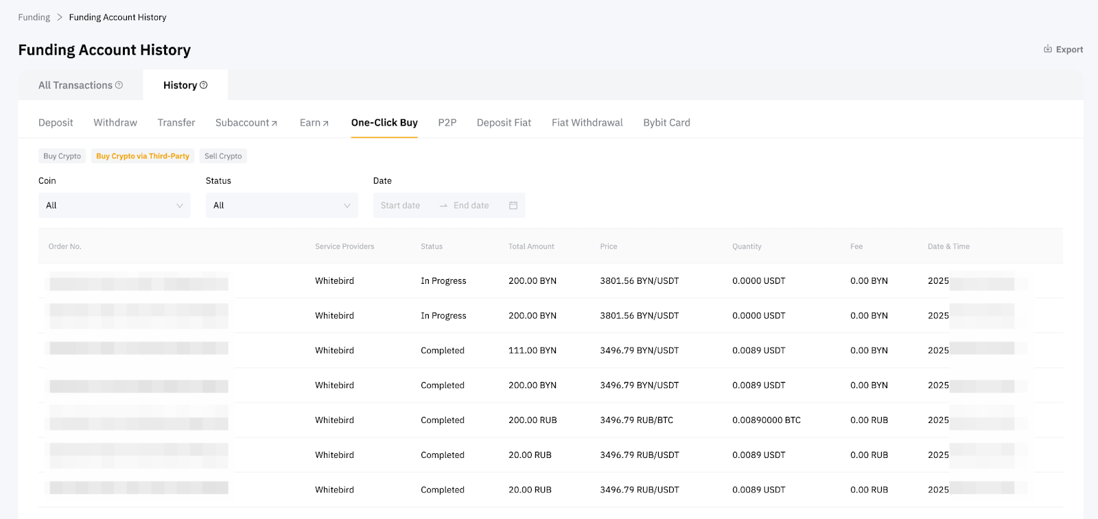 Step 5: After successfully purchasing crypto in your Bybit account, you can find your asset in the Funding Account. If you would like to view the historical transaction records, they can be found under the Buy Crypto via Third-Party on the Order History page.