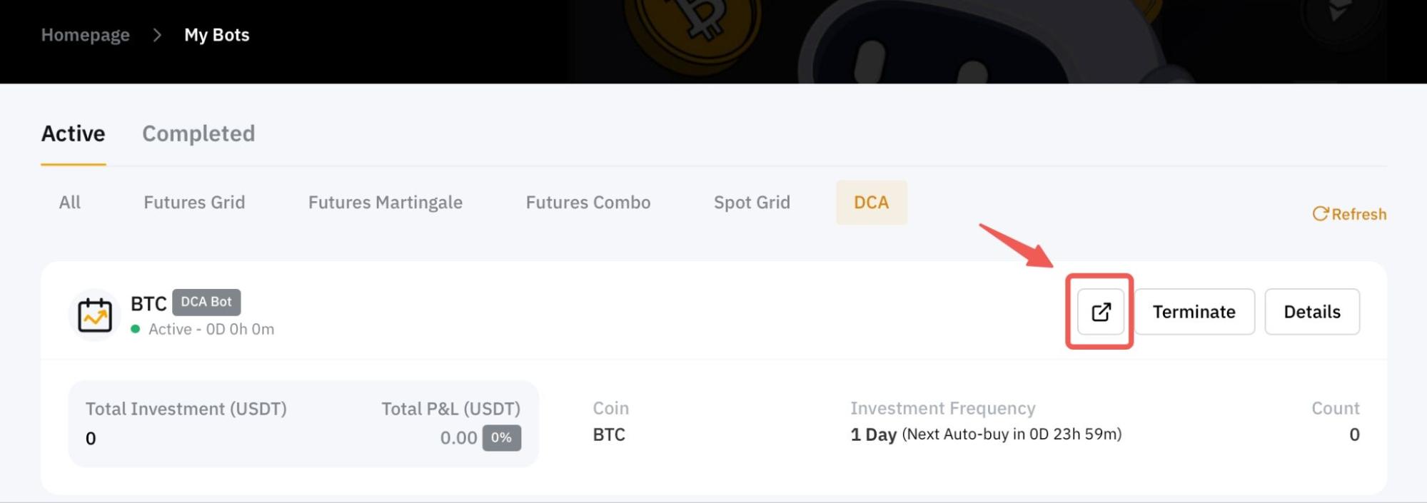 *If the total investment amount triggers the maximum investment amount, the DCA bot will automatically terminate and all assets will be transferred to your Funding Account.