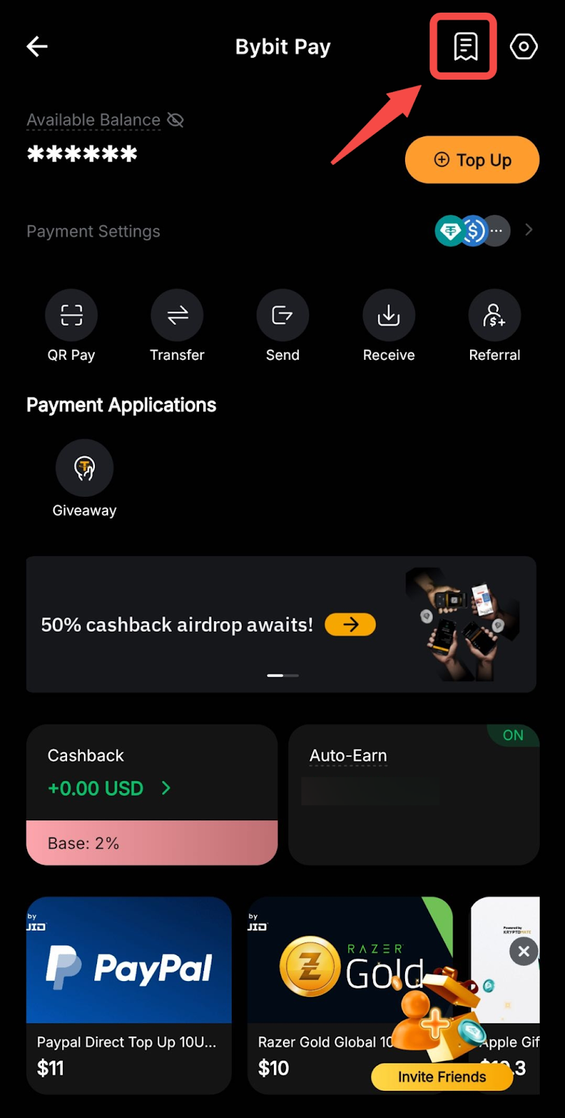 To view your payment history, you may head to the Bybit Pay page and click on the Paper icon in the top right corner.