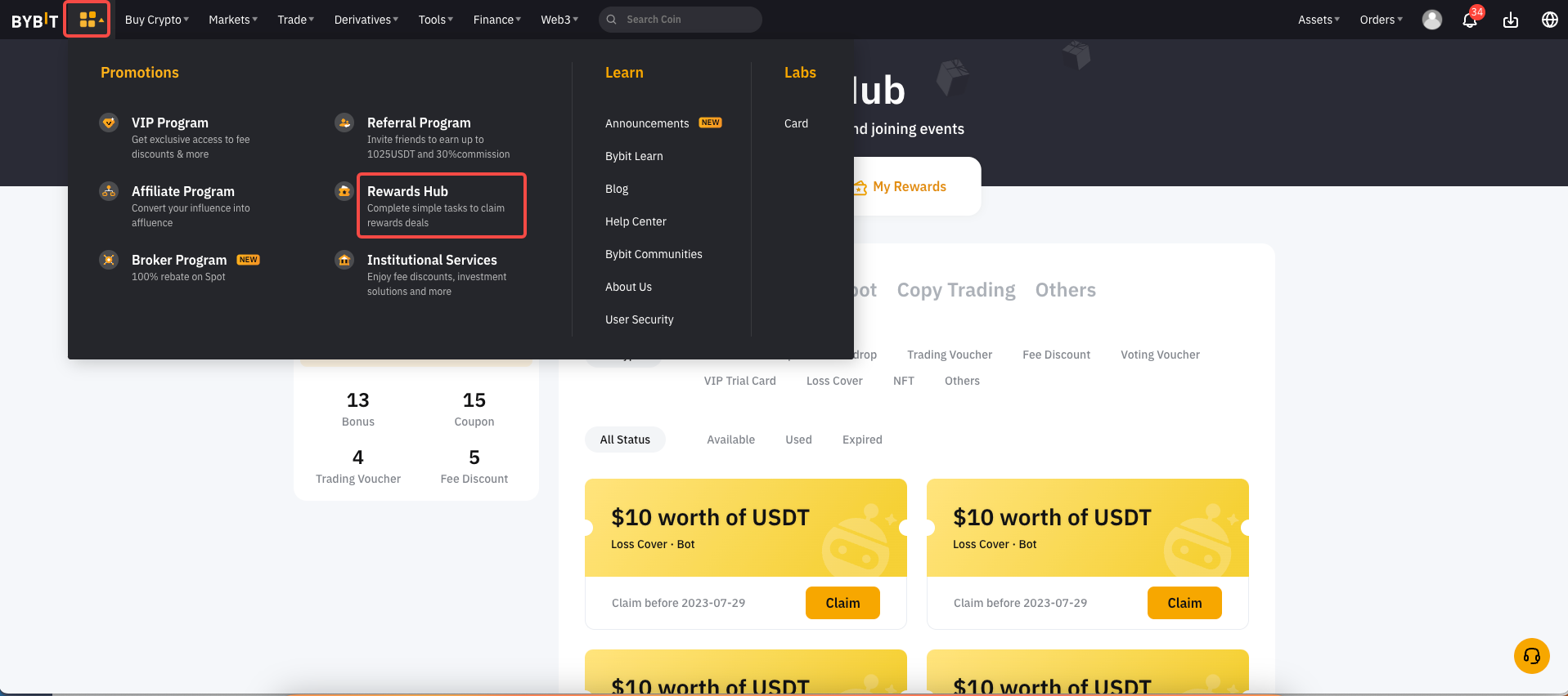 The Loss Cover Voucher is a reward designed to help offset potential losses incurred during bot trading. Traders can claim this voucher from the Rewards Hub and apply it to various trading bots, such as Spot Grid bot, Futures Grid bot, and DCA bot.