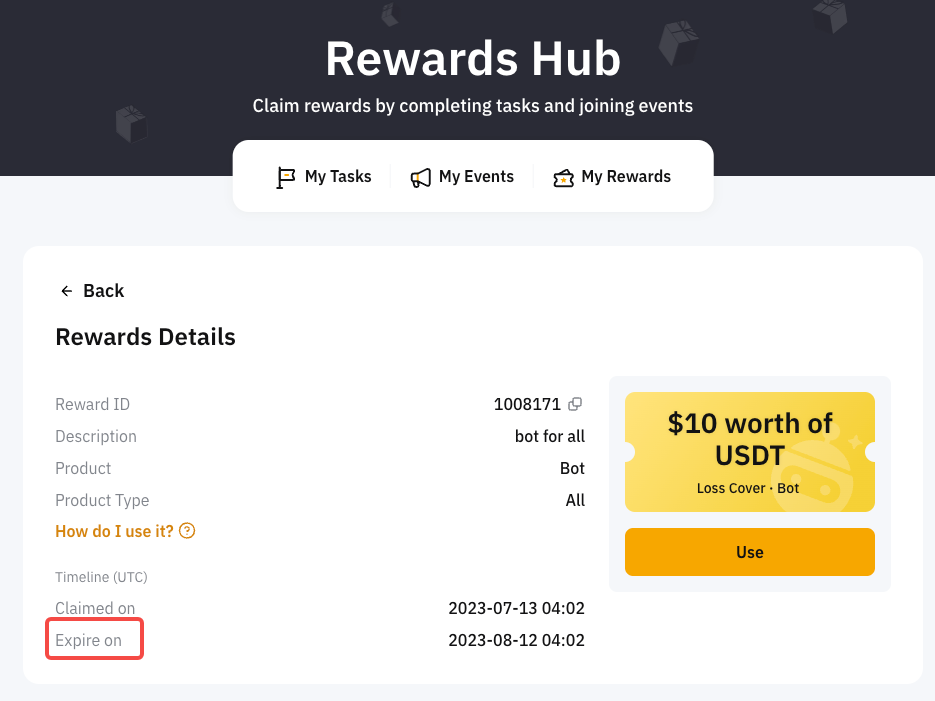 Once you have successfully claimed your voucher, you can click on View Rewards to review the details. If you wish to use it immediately, click on Use. This will redirect you to the Trading Bot page where you can create a bot.