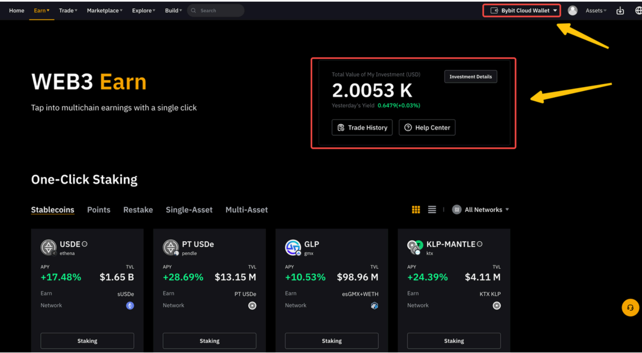 Setelah menghubungkan dompet Anda, total nilai investasi Anda dari semua kumpulan staking akan ditampilkan di dasbor di sudut kanan atas.