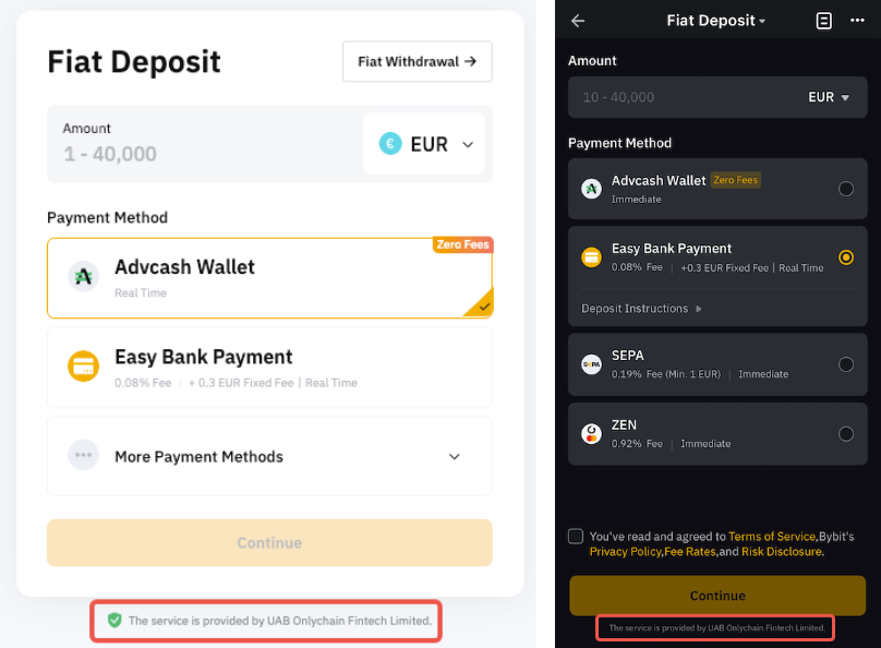 Devido aos requisitos de conformidade, os usuários que fazem seu primeiro depósito através da UAB Onlychain Fintech Limited podem ser obrigados a fornecer documentos de identidade adicionais além da carteira de motorista.