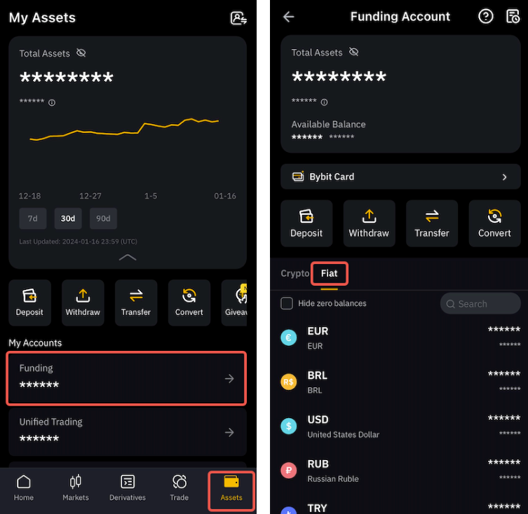 No aplicativo, toque em Ativos → Fundos → Fiat.