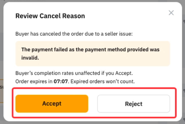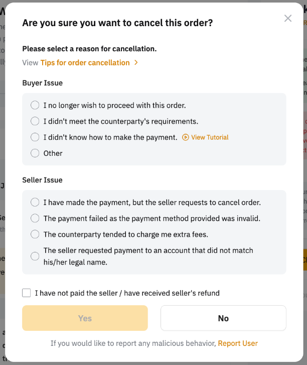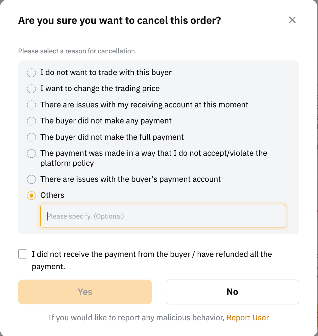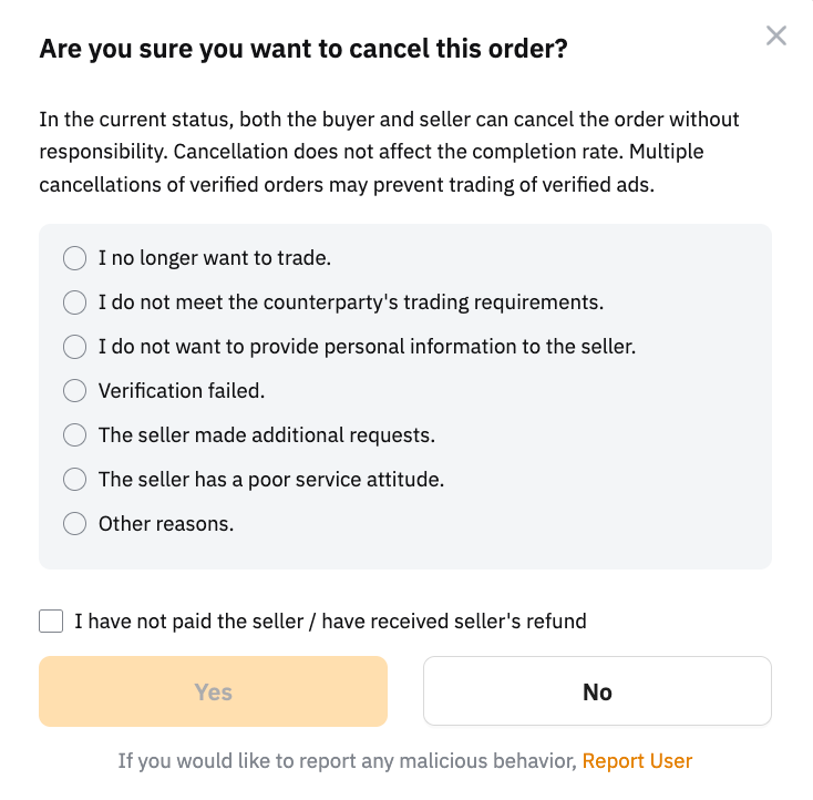 — Выбор причины отмены в разделе Проблема с покупателем означает, что вы подтверждаете ответственность за отмену ордера. В результате этого процент выполнения будет изменен, и дальнейшие апелляции не будут разрешены.