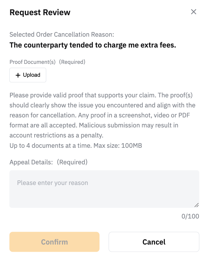 Если вы твердо считаете, что отмена была вызвана виной продавца, подайте апелляцию, нажав Запросить проверку и предоставив действительное доказательство, подтверждающее вашу претензию. Специалист P2P поможет вам в течение 1–2 рабочих дней.