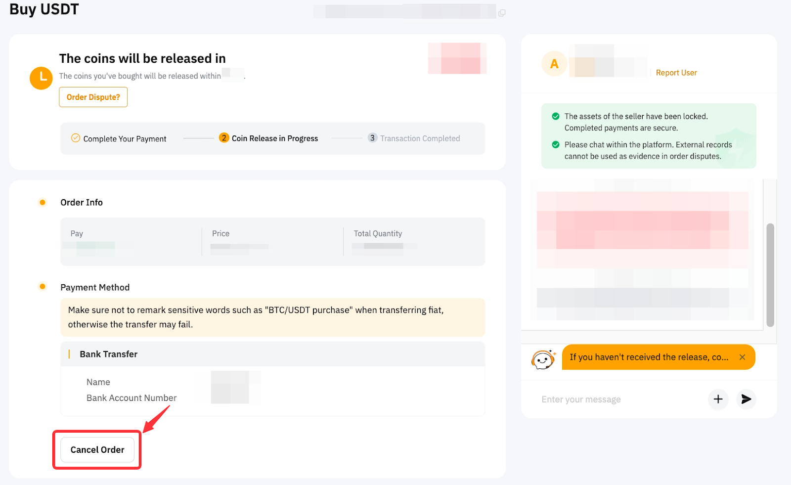 Шаг 1. Нажмите Отменить ордер в нижней части страницы P2P-ордера.