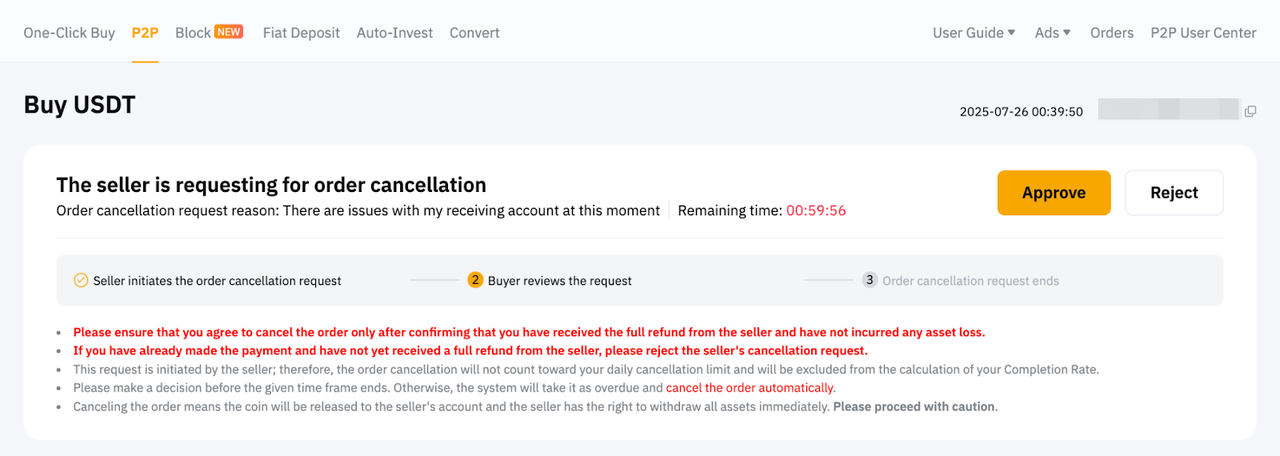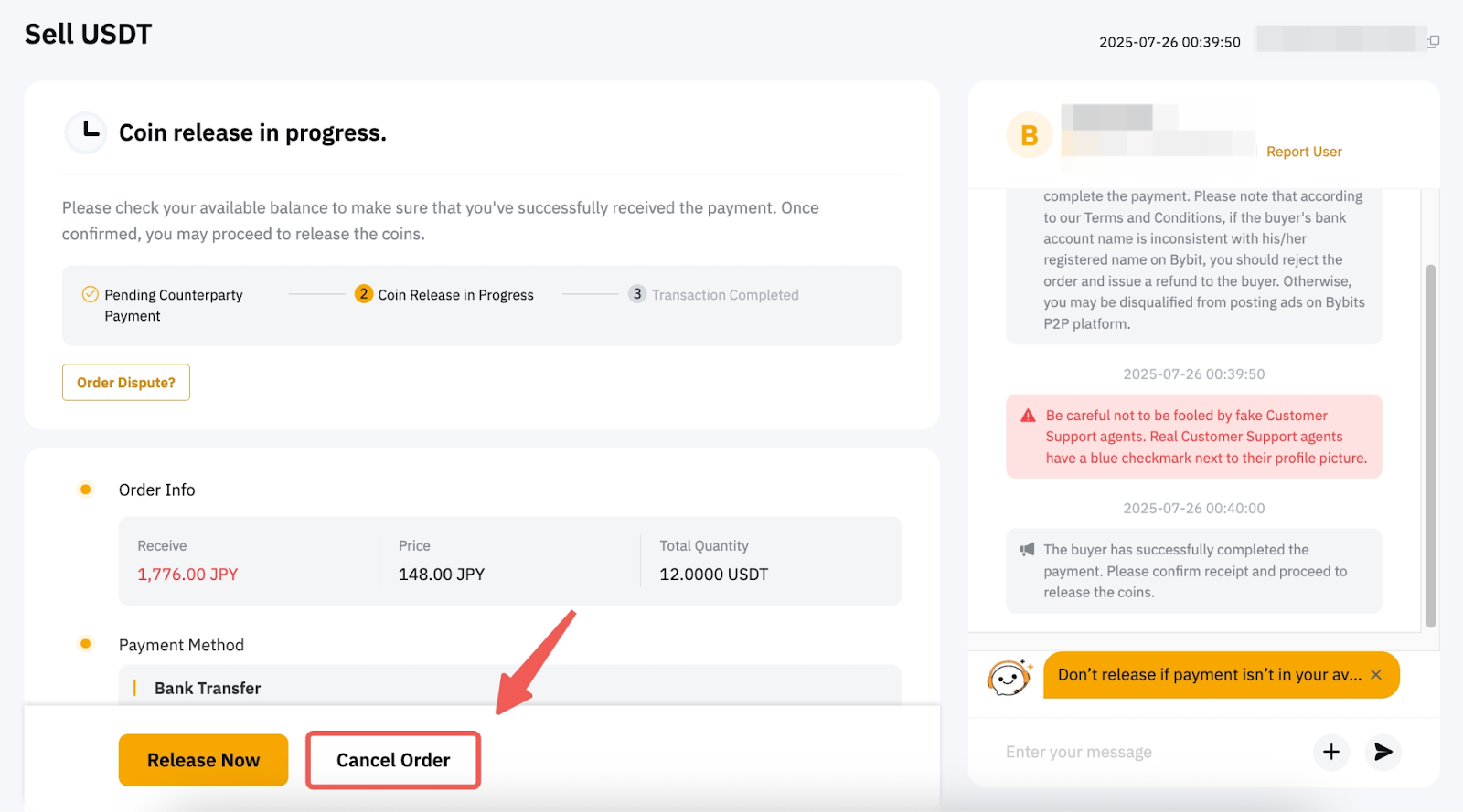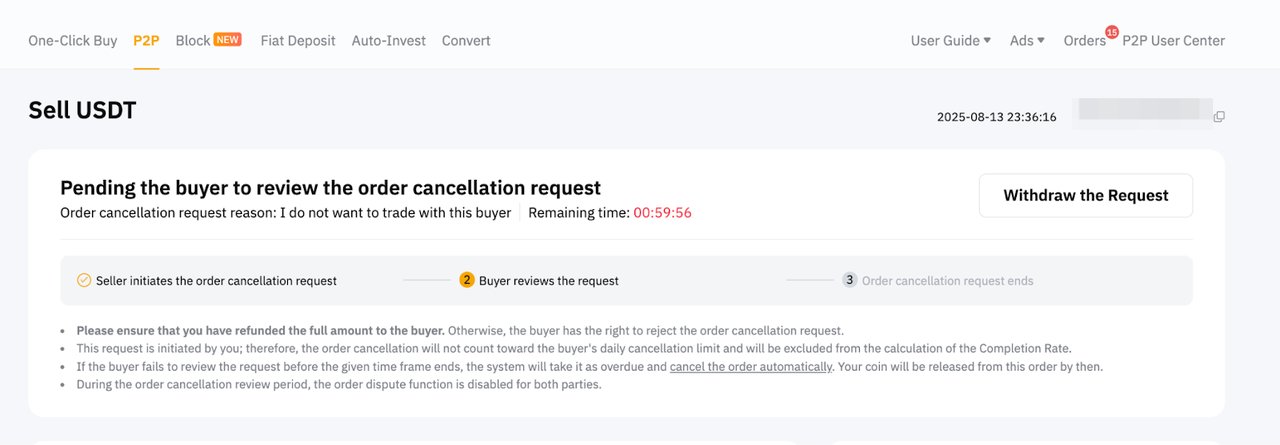 2. ПРОДАВЕЦ может подать запрос на отмену ордера, чтобы покупатель мог проверить, когда статус ордера будет Перевести Монеты.
