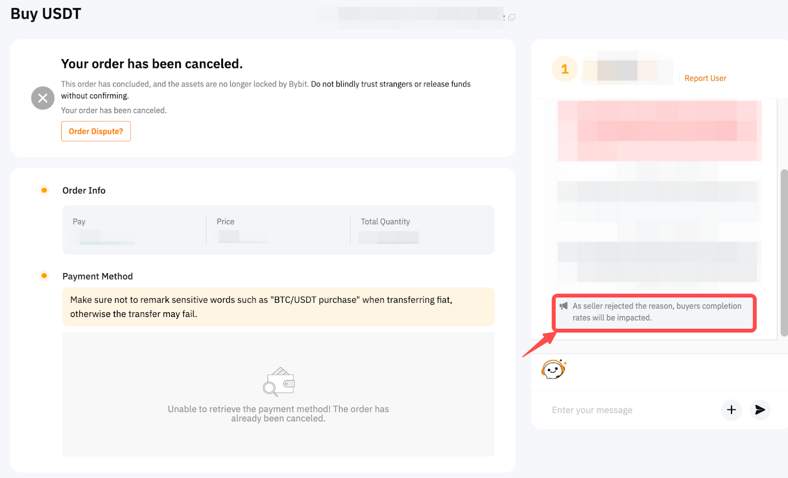 • Если оплата была произведена успешно, отклоните запрос и свяжитесь с продавцом через чат ордера.