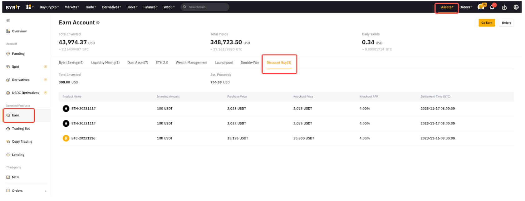 Помимо этого, чтобы перейти на страницу Earn аккаунта, можно нажать на «Активы» в верхнем правом углу страницы Bybit. С этой страницы можно просматривать все имеющиеся ордера.