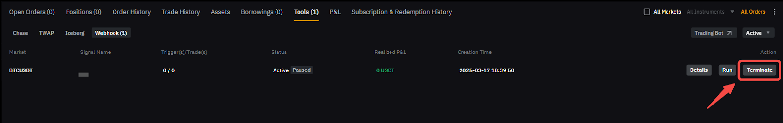 Прекращение или приостановка вручную: чтобы отключить веб-хук сигналы вручную, перейдите на вкладку Инструменты. Чтобы закрыть сигнал, найдите сигнал, инициированный веб-хуком, и нажмите Завершить. Для временной остановки стратегии нажмите кнопку Пауза.