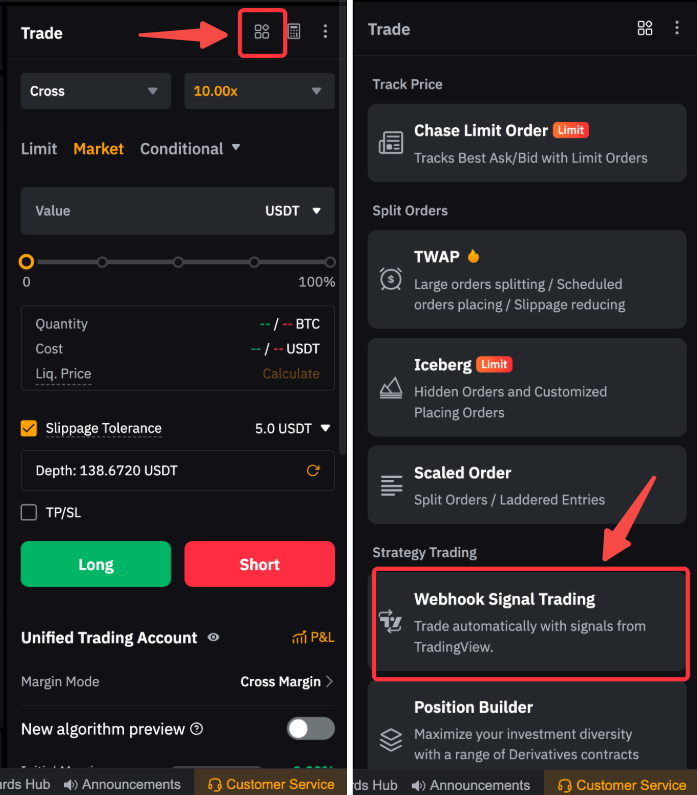 Шаг 1. Откройте страницу нужного контракта во вкладке Торговать, нажмите Инструменты в зоне ордера, а затем Сигнальная торговля с веб-хуком.