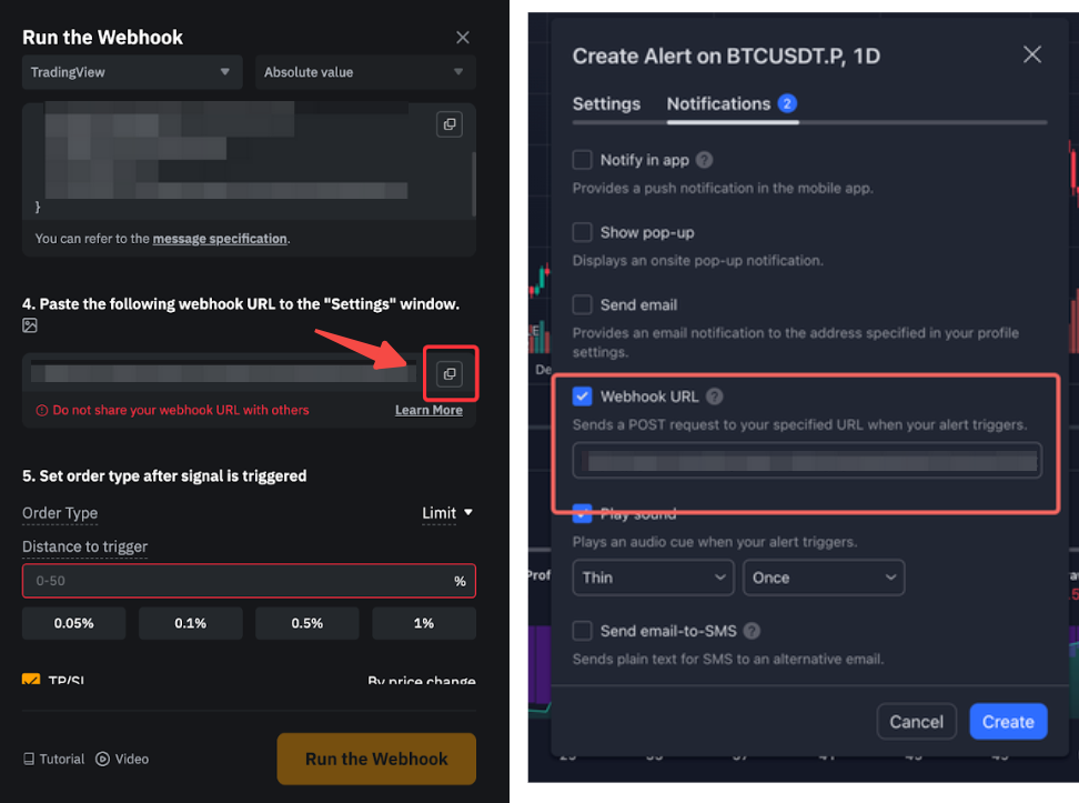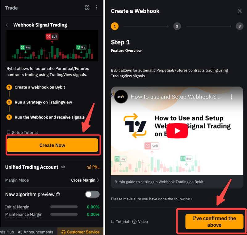 Шаг 2. Нажмите Создать. Убедитесь, что вы поняли описание этой функции. Для получения дополнительной информации о сигнальной торговле с веб-хуком посмотрите обучающее видео и нажмите Я подтверждаю перечисленное выше.