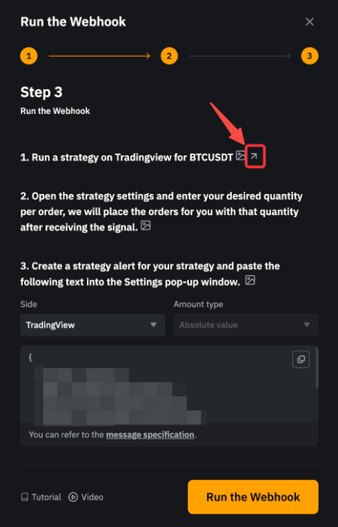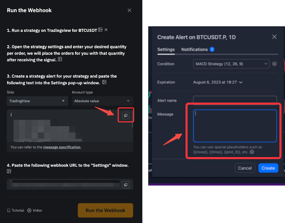 Шаг 5. Чтобы создать оповещение для стратегии, нажмите на значок Оповещение на тестере стратегии и вставьте во всплывающее окно шаблон сообщения и URL-адрес веб-хука.
