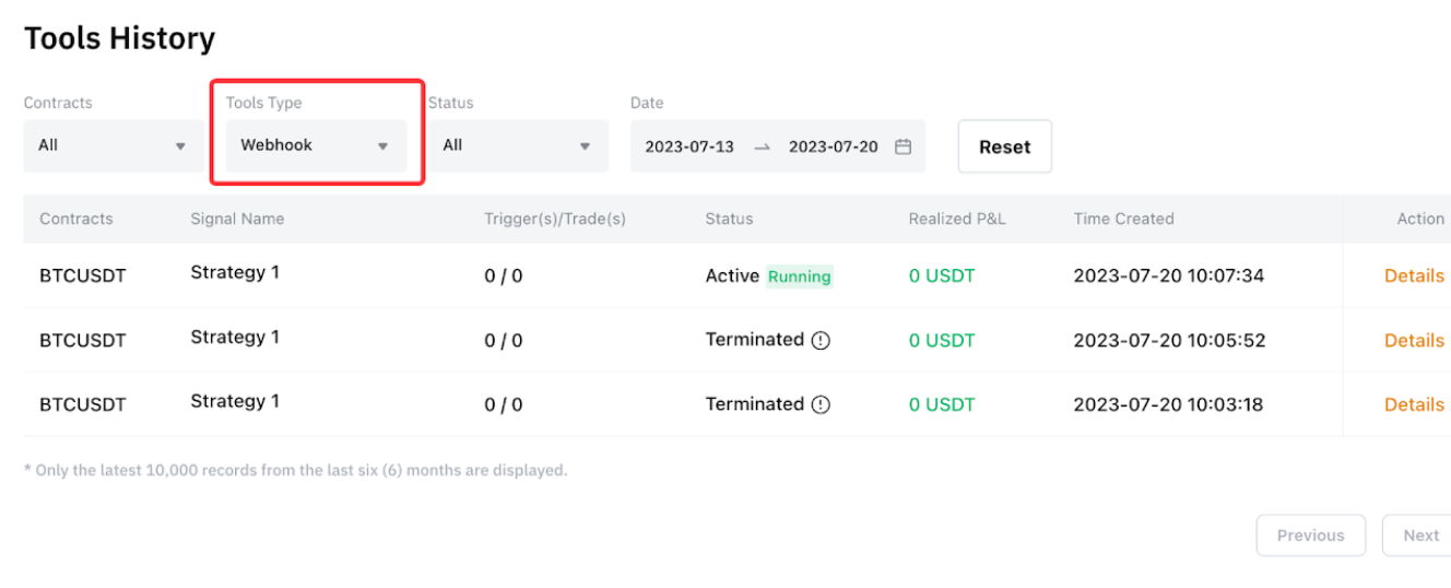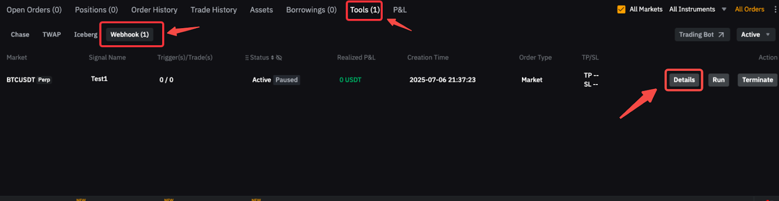 Для просмотра конкретных сведений о веб-хук сигнале перейдите на вкладку Инструменты, а затем нажмите Веб-хук. Здесь можно просмотреть название сигнала, время запуска / сделки, отчет о прибыли и убытках и время создания.