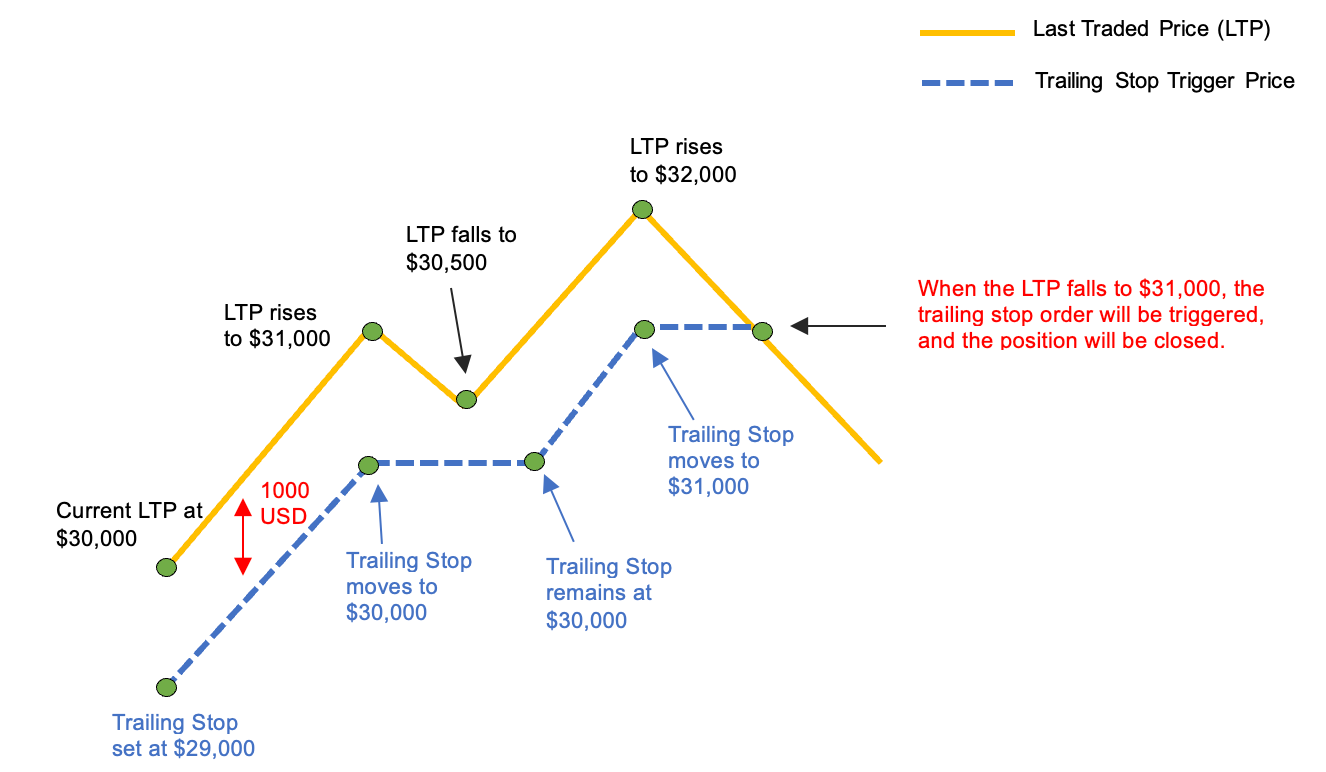 1. Если цена последней сделки так и не превысит 30 000 USD, Трейлинг стоп-ордер будет активирован на уровне 29 000 USD, аналогично обычному стоп-лоссу.