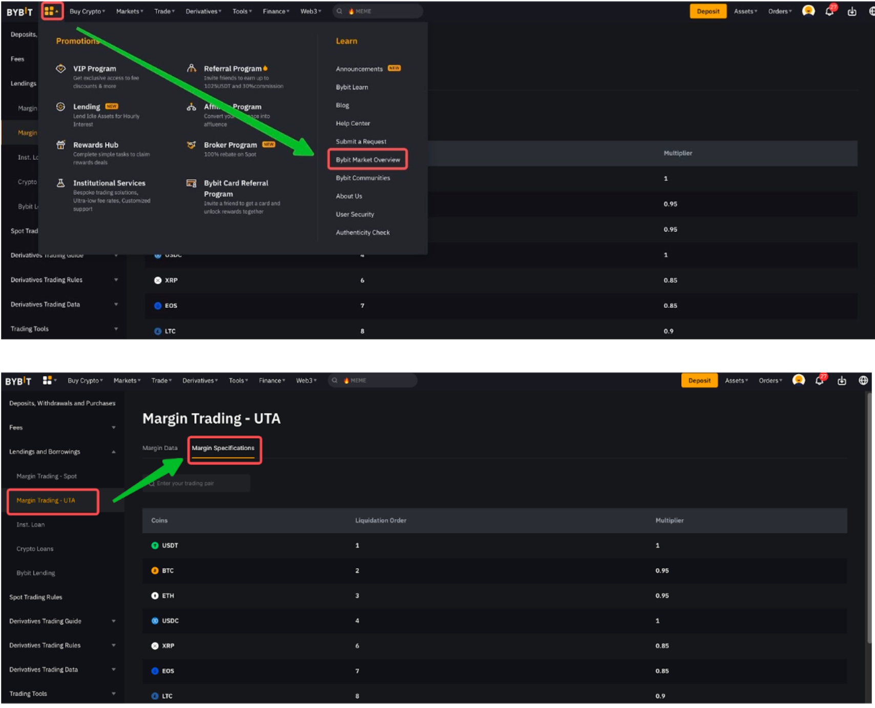 要查看统一交易账户下每枚代币的抵押价值比率,请前往左上角的应用程序图标,然后选择 Bybit 市场总览