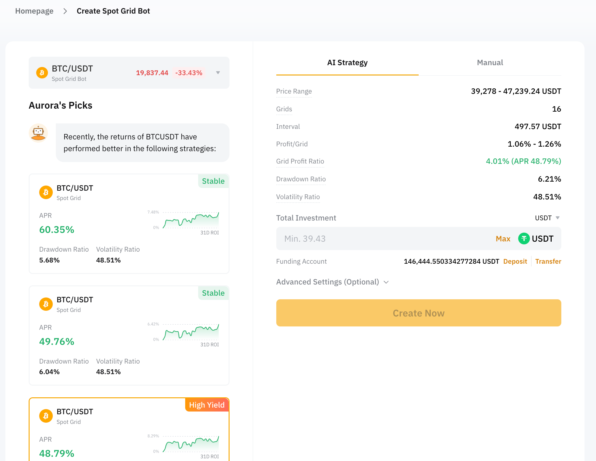 您选择 AI 智能策略后,系统将根据现货交易对的历史数据表现建议相关参数。或者您也可以参考 Aurora 精选提供的建议,根据您的偏好创建现货网格机器人。