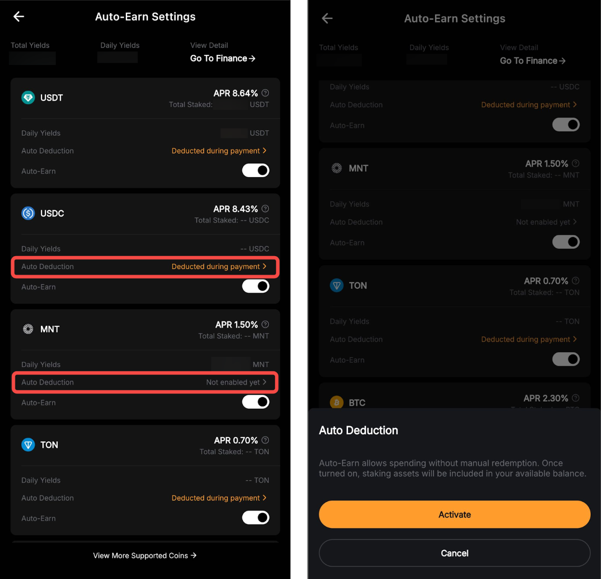 通过启用“自动理财”按钮,您的资金账户中的支付加密资产(每种货币上显示)的可转让余额将在第二天自动订阅灵活期限计划。