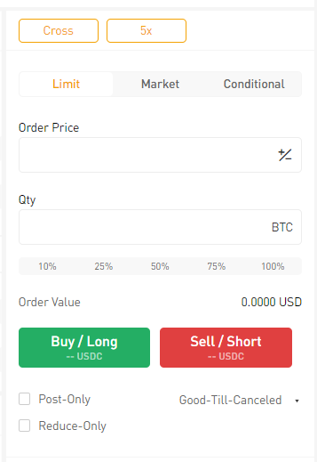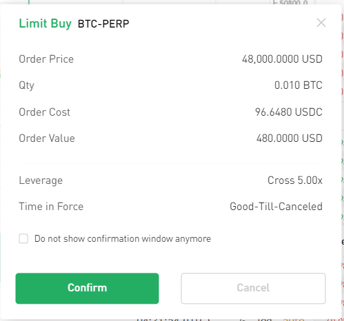 以 BTC-PERP 限價單為例,請按照以下步驟委託訂單。